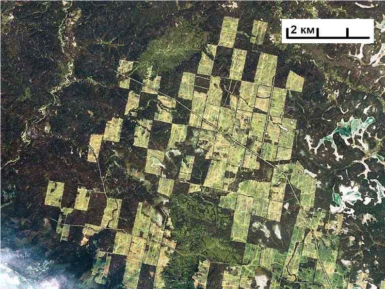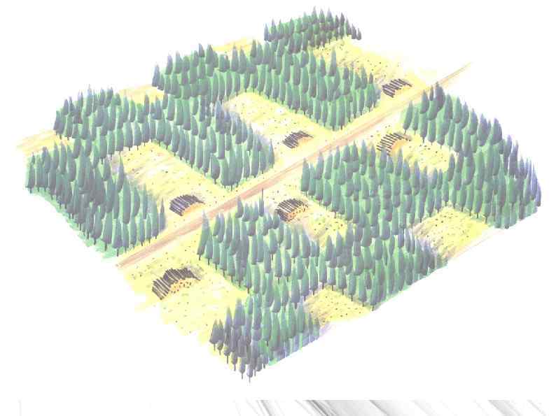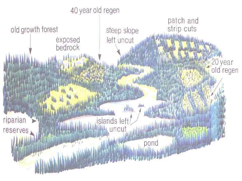 В лесном хозяйстве, основанном на проведении сплошных рубок, каждый выдел представлен преимущественно деревьями одной породы, а ландшафты варьируют от вырубленных делянок и молодого леса до спелого леса