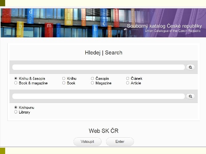 Knihovníkům SK ČR umožňuje p objednávat pro uživatele dokumenty prostřednictvím MVS – staré tisky se nepůjčují p on-line editovat některé údaje v SK ČR a bázi ADR on-line připojit údaje o digitalizovaném dokumentu exportovat záznamy ze SK ČR (využíváno u seriálů) stahovat záznamy ze SK ČR protokol Z 39. 50 – UNIMARC a MARC 21 http: //www. stk. cz/ZIG/TAB 1_Z 3950. html kontrolovat správnost zpracování záznamů p p (týká se knihoven, které dodávají záznamy do SK ČR v elektronické podobě)