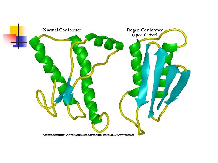Prion Protein (Pr. P) n n The gene (PRPN) is located on the short arm of chromosome 20 Encodes a protein (Pr. Pc) found in normal brain (alpha helical); normal function unknown Pr. Psc (Pr. P in scrapie infected anmals) is a conformational isomer of Pr. Pc (B-pleated sheet) Pr. Psc is resistant to digestion with proteases and has a tendency to polymerise into scrapie -associated fibrils or prion rods