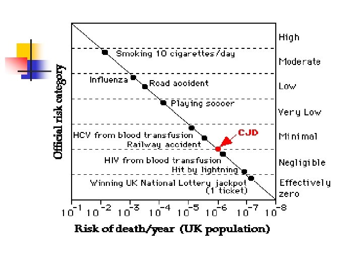 nv. CJD and BSE n Despite the apparent link between nv. CJD and BSE, the number of cases of nv. CJD has remained small. Possible reasons include: n n Low levels of Pr. Psc in milk and meat Inefficiency of oral route of infection Restriction of spread based upon a species barrier Low incidence of host genetic factors such as the frequency of homozygosity at codon 129