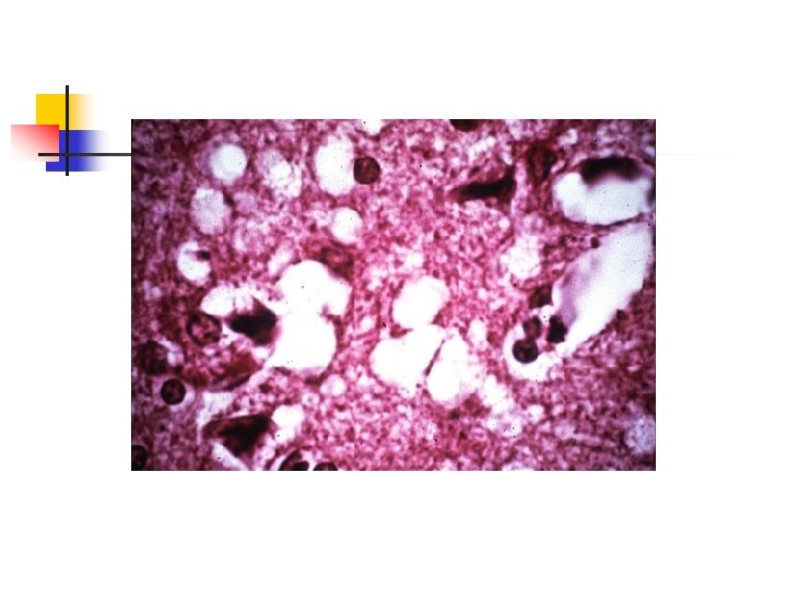Neuropathology n n Neuronal loss Proliferation of glial cells Absence of an inflammatory response Presence of small vacuoles which produces a spongiform appearance