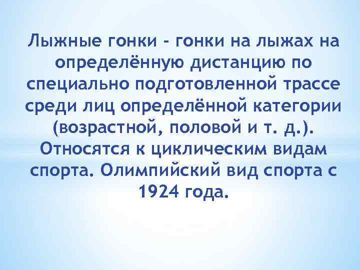 Лыжные гонки - гонки на лыжах на определённую дистанцию по специально подготовленной трассе среди лиц определённой категории (возрастной, половой и т. д. ). Относятся к циклическим видам спорта. Олимпийский вид спорта с 1924 года.