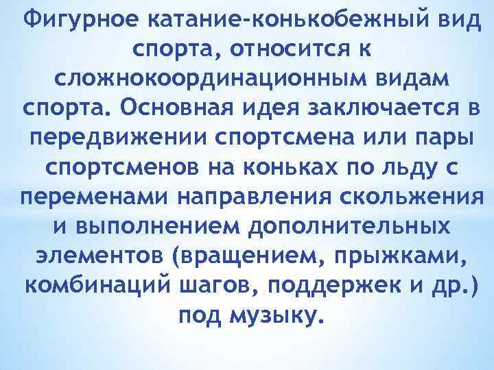 Фигурное катание-конькобежный вид спорта, относится к сложнокоординационным видам спорта. Основная идея заключается в передвижении спортсмена или пары спортсменов на коньках по льду с переменами направления скольжения и выполнением дополнительных элементов (вращением, прыжками, комбинаций шагов, поддержек и др. ) под музыку.