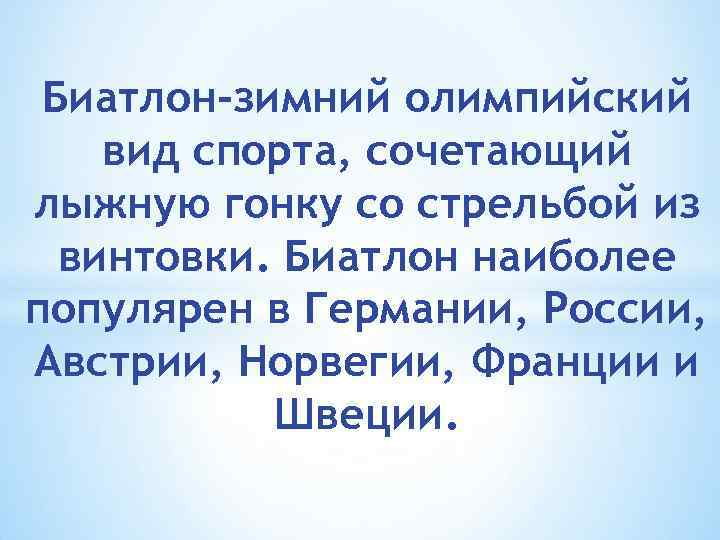 Биатлон-зимний олимпийский вид спорта, сочетающий лыжную гонку со стрельбой из винтовки. Биатлон наиболее популярен в Германии, России, Австрии, Норвегии, Франции и Швеции.