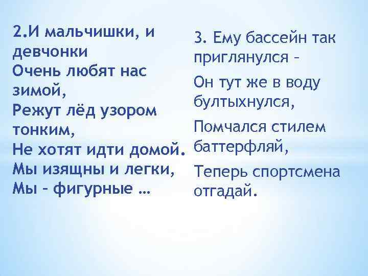 2. И мальчишки, и девчонки Очень любят нас зимой, Режут лёд узором тонким, Не хотят идти домой. Мы изящны и легки, Мы – фигурные … 3. Ему бассейн так приглянулся – Он тут же в воду бултыхнулся, Помчался стилем баттерфляй, Теперь спортсмена отгадай.