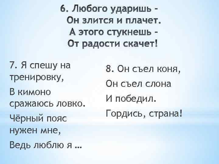 7. Я спешу на тренировку, 8. Он съел коня, В кимоно сражаюсь ловко. И победил. Чёрный пояс нужен мне, Ведь люблю я … Он съел слона Гордись, страна!