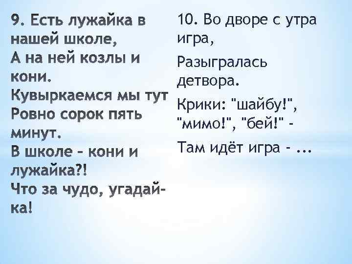 10. Во дворе с утра игра, Разыгралась детвора. Крики: "шайбу!", "мимо!", "бей!" Там идёт игра -. . .