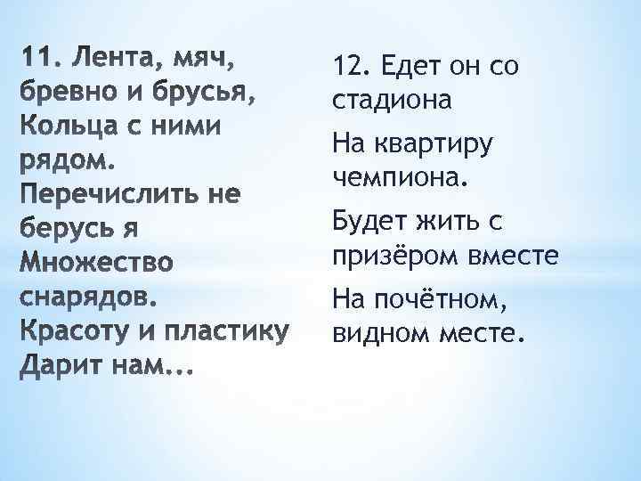 12. Едет он со стадиона На квартиру чемпиона. Будет жить с призёром вместе На почётном, видном месте.