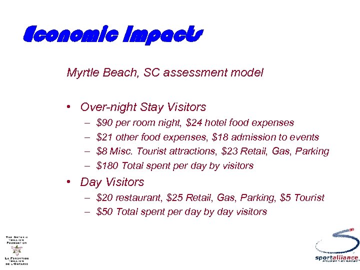 Economic Impacts Myrtle Beach, SC assessment model • Over-night Stay Visitors – – $90 per room night, $24 hotel food expenses $21 other food expenses, $18 admission to events $8 Misc. Tourist attractions, $23 Retail, Gas, Parking $180 Total spent per day by visitors • Day Visitors – $20 restaurant, $25 Retail, Gas, Parking, $5 Tourist – $50 Total spent per day by day visitors