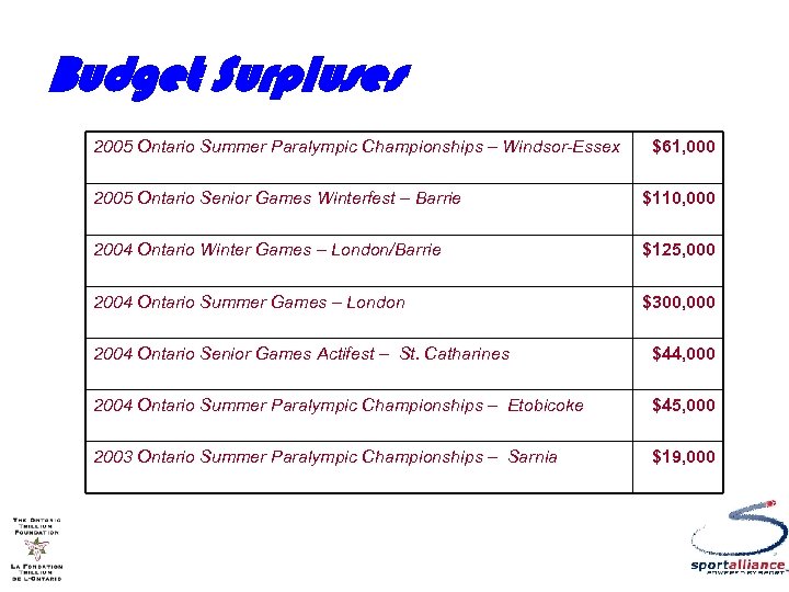 Budget Surpluses 2005 Ontario Summer Paralympic Championships – Windsor-Essex $61, 000 2005 Ontario Senior Games Winterfest – Barrie $110, 000 2004 Ontario Winter Games – London/Barrie $125, 000 2004 Ontario Summer Games – London $300, 000 2004 Ontario Senior Games Actifest – St. Catharines $44, 000 2004 Ontario Summer Paralympic Championships – Etobicoke $45, 000 2003 Ontario Summer Paralympic Championships – Sarnia $19, 000