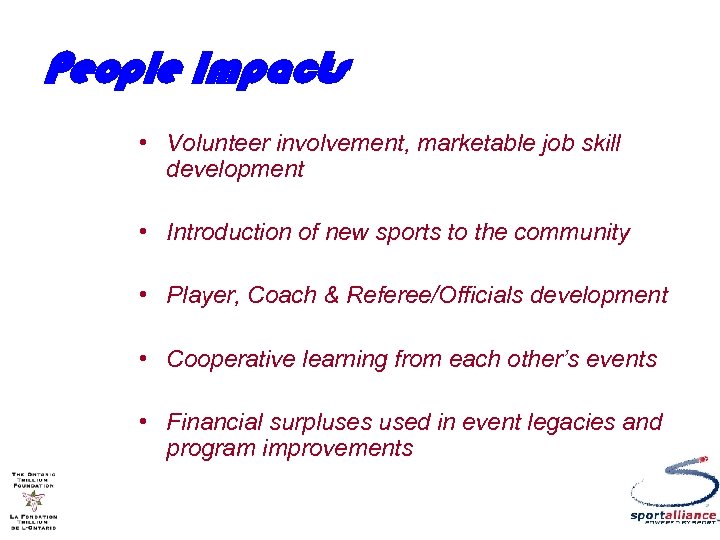 People Impacts • Volunteer involvement, marketable job skill development • Introduction of new sports to the community • Player, Coach & Referee/Officials development • Cooperative learning from each other’s events • Financial surpluses used in event legacies and program improvements