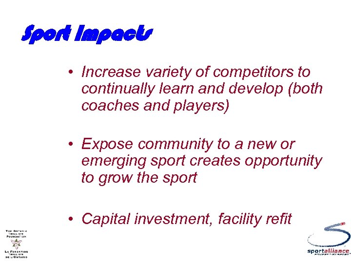 Sport Impacts • Increase variety of competitors to continually learn and develop (both coaches and players) • Expose community to a new or emerging sport creates opportunity to grow the sport • Capital investment, facility refit