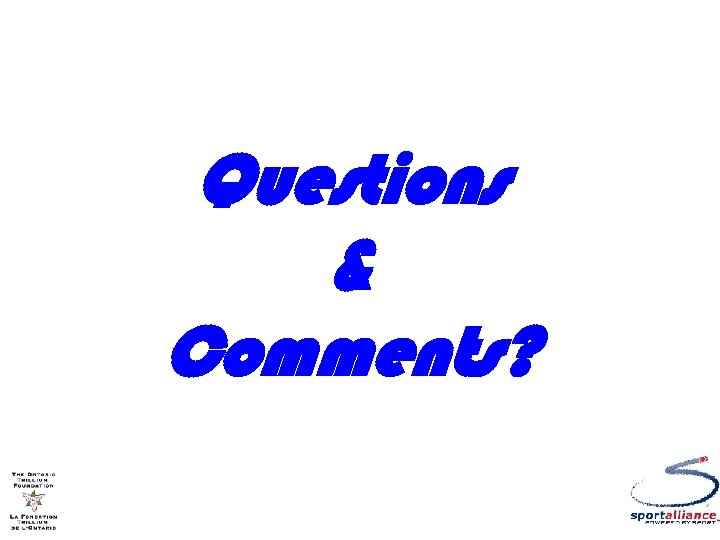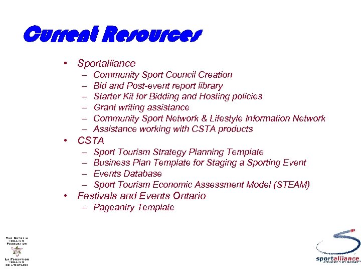 Current Resources • Sportalliance – – – Community Sport Council Creation Bid and Post-event report library Starter Kit for Bidding and Hosting policies Grant writing assistance Community Sport Network & Lifestyle Information Network Assistance working with CSTA products • CSTA – – Sport Tourism Strategy Planning Template Business Plan Template for Staging a Sporting Events Database Sport Tourism Economic Assessment Model (STEAM) • Festivals and Events Ontario – Pageantry Template