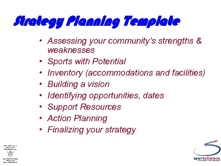 Strategy Planning Template • Assessing your community’s strengths & weaknesses • Sports with Potential • Inventory (accommodations and facilities) • Building a vision • Identifying opportunities, dates • Support Resources • Action Planning • Finalizing your strategy