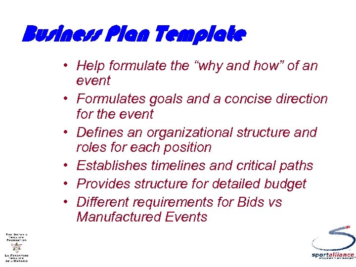 Business Plan Template • Help formulate the “why and how” of an event • Formulates goals and a concise direction for the event • Defines an organizational structure and roles for each position • Establishes timelines and critical paths • Provides structure for detailed budget • Different requirements for Bids vs Manufactured Events