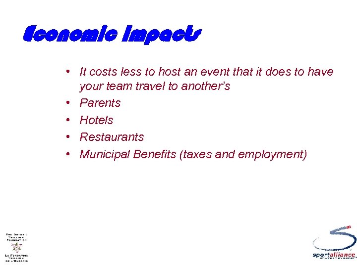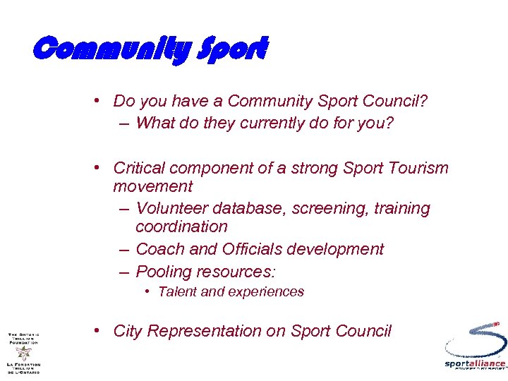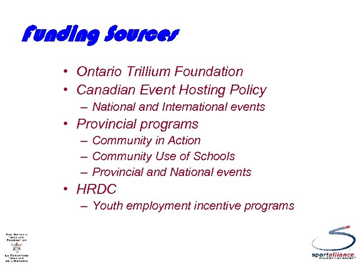 Funding Sources • Ontario Trillium Foundation • Canadian Event Hosting Policy – National and International events • Provincial programs – Community in Action – Community Use of Schools – Provincial and National events • HRDC – Youth employment incentive programs