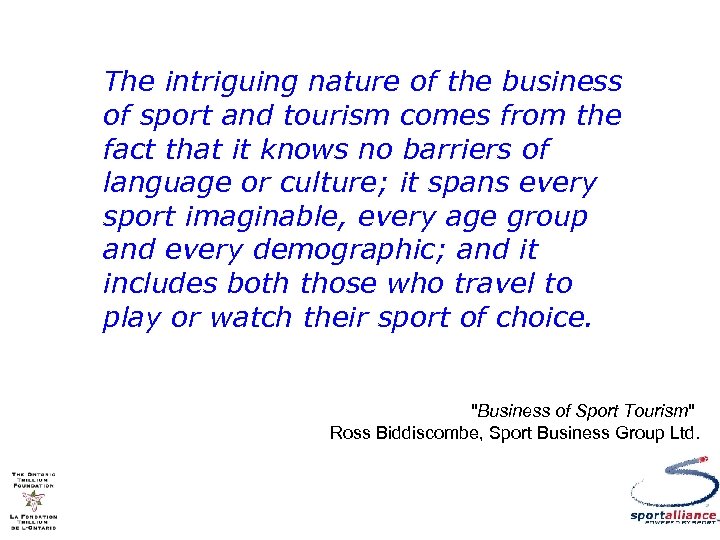 The intriguing nature of the business of sport and tourism comes from the fact that it knows no barriers of language or culture; it spans every sport imaginable, every age group and every demographic; and it includes both those who travel to play or watch their sport of choice. "Business of Sport Tourism" Ross Biddiscombe, Sport Business Group Ltd.