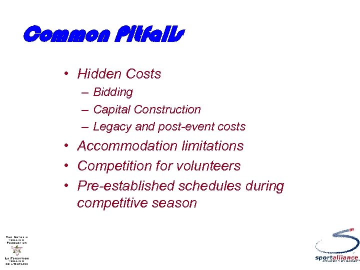 Common Pitfalls • Hidden Costs – Bidding – Capital Construction – Legacy and post-event costs • Accommodation limitations • Competition for volunteers • Pre-established schedules during competitive season