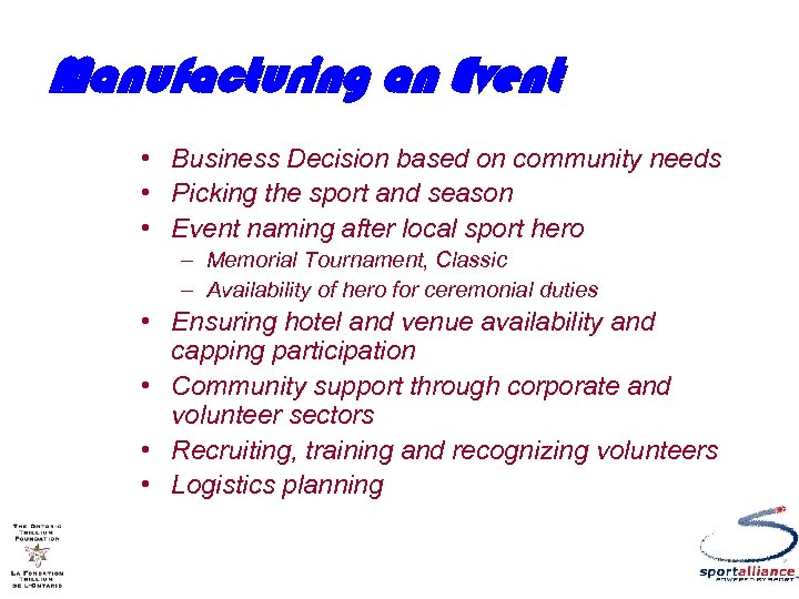 Manufacturing an Event • Business Decision based on community needs • Picking the sport and season • Event naming after local sport hero – Memorial Tournament, Classic – Availability of hero for ceremonial duties • Ensuring hotel and venue availability and capping participation • Community support through corporate and volunteer sectors • Recruiting, training and recognizing volunteers • Logistics planning