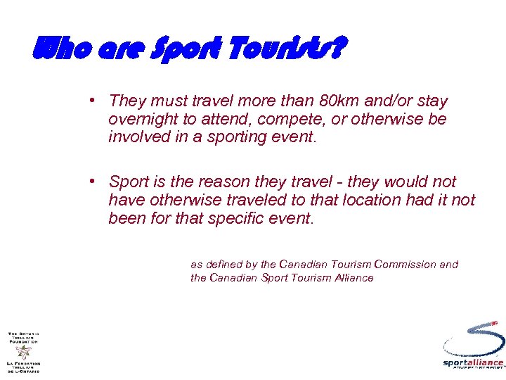 Who are Sport Tourists? • They must travel more than 80 km and/or stay overnight to attend, compete, or otherwise be involved in a sporting event. • Sport is the reason they travel - they would not have otherwise traveled to that location had it not been for that specific event. as defined by the Canadian Tourism Commission and the Canadian Sport Tourism Alliance