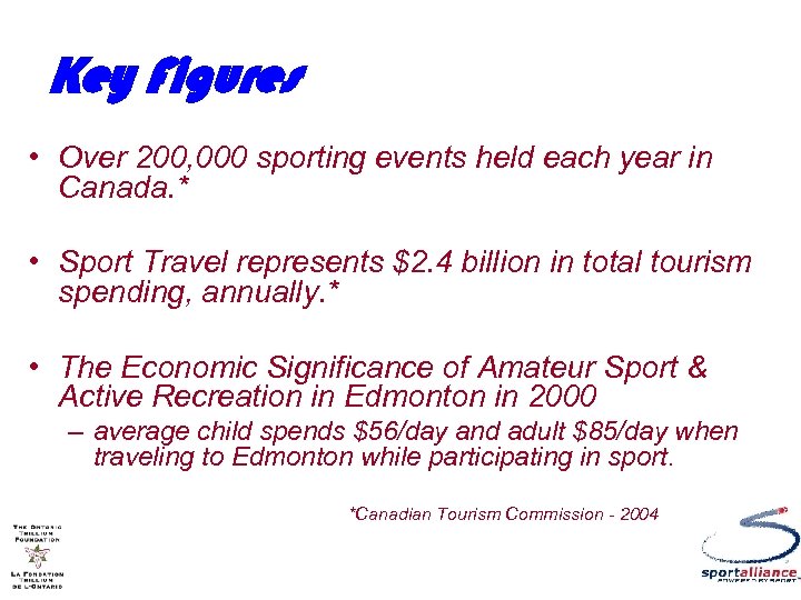 Key Figures • Over 200, 000 sporting events held each year in Canada. * • Sport Travel represents $2. 4 billion in total tourism spending, annually. * • The Economic Significance of Amateur Sport & Active Recreation in Edmonton in 2000 – average child spends $56/day and adult $85/day when traveling to Edmonton while participating in sport. *Canadian Tourism Commission - 2004