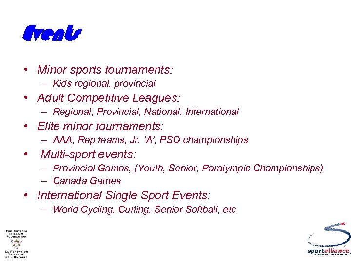 Events • Minor sports tournaments: – Kids regional, provincial • Adult Competitive Leagues: – Regional, Provincial, National, International • Elite minor tournaments: – AAA, Rep teams, Jr. ‘A’, PSO championships • Multi-sport events: – Provincial Games, (Youth, Senior, Paralympic Championships) – Canada Games • International Single Sport Events: – World Cycling, Curling, Senior Softball, etc