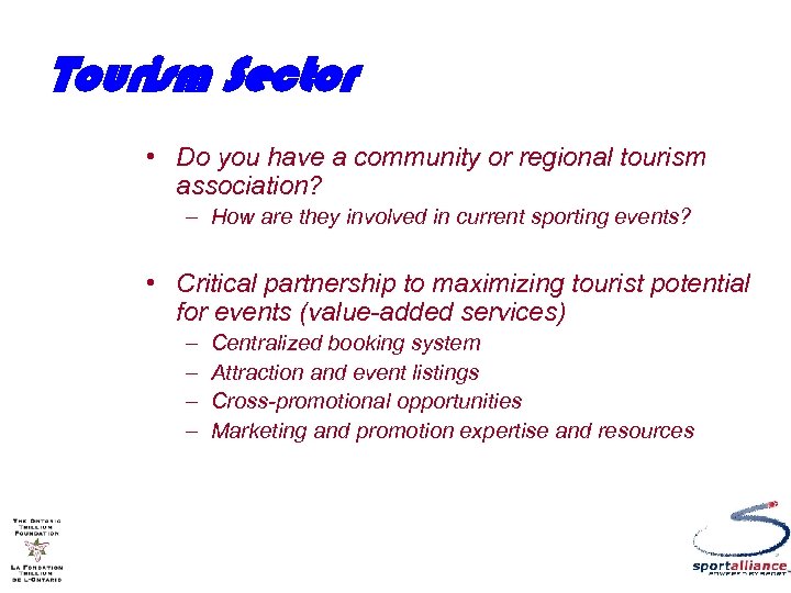 Tourism Sector • Do you have a community or regional tourism association? – How are they involved in current sporting events? • Critical partnership to maximizing tourist potential for events (value-added services) – – Centralized booking system Attraction and event listings Cross-promotional opportunities Marketing and promotion expertise and resources