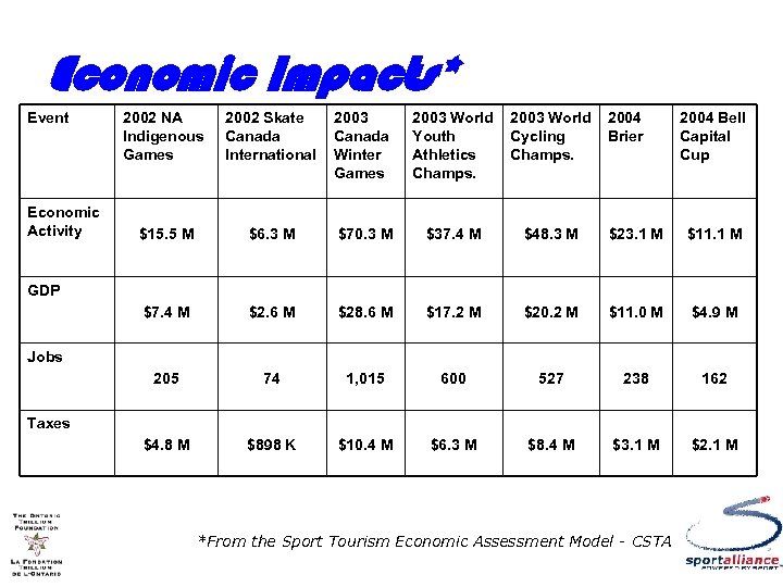 Economic Impacts* Event 2002 Skate Canada International 2003 Canada Winter Games 2003 World Youth Athletics Champs. 2003 World Cycling Champs. $15. 5 M $6. 3 M $70. 3 M $37. 4 M $48. 3 M $23. 1 M $11. 1 M $7. 4 M $2. 6 M $28. 6 M $17. 2 M $20. 2 M $11. 0 M $4. 9 M 205 Economic Activity 2002 NA Indigenous Games 2004 Brier 2004 Bell Capital Cup 74 1, 015 600 527 238 162 $4. 8 M $898 K $10. 4 M $6. 3 M $8. 4 M $3. 1 M $2. 1 M GDP Jobs Taxes *From the Sport Tourism Economic Assessment Model - CSTA