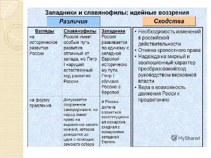 В первой половине XIX в. в России формируется идеологическое осмысление существующего общественного строя. Граф С. С. Уваров и его теория официальной народности отражали и выражали самодержавную (официальную) точку зрения. Но рядом с этим возникли иные идеологические направления. Наиболее заметными являлись два течения, представителей которых начали называть славянофилами и западниками. Славянофилы, или в буквальном смысле «славянолюбы» , появились в России в период николаевского царствования. Система взглядов славянофилов сформировалась в 1830— 1840 -е гг.