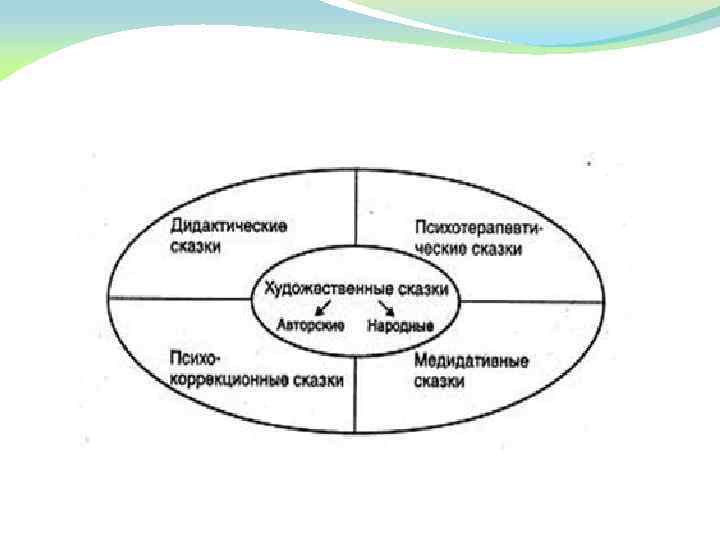 Виды терапевтических сказок 1. Терапевтические сказки о ребёнке, который похож на малыша. В таких сказках главным героем вы делаете ребёнка, который попадает в ситуацию, похожую на ситуацию вашего малыша. Сказка не должна прямо повторять сюжет из жизни вашего малыша, но должна быть похожей. Ребёнок понимает, что не один он может оказаться в подобной ситуации, и на примере другого ребёнка делает выводы и учится самостоятельно решать проблему. Такие сказки всегда развиваются по определённому сценарию: Знакомство с героями (Жил-был мальчик Петя, который…). Если ребёнок очень маленький, то на месте героя может быть животное, игрушка. Для детей постарше гораздо эффективнее, если героем сказки будет настоящий ребёнок. Для дошкольников (после 4 лет) желательно вводить в сказку волшебных героев или волшебные предметы, а с 5 лет волшебство является обязательным условием сказки (в большинстве случаев). Проблема. Герой сказки сталкивается с проблемой, конфликтом, страхом, присущим вашему ребёнку. Пути решения проблемы. Рассказывается, что нужно сделать герою сказки, чтобы справиться с проблемой. Нередко при этом ему необходима помощь волшебных предметов. Кульминация. Герой сказки справляется с проблемой. Развязка. У терапевтической сказки всегда должна быть развязка. Нельзя оставлять конец открытым, недоделанным. Мораль. Выводы, которые делает герой сказки. Мораль не должна быть затянута, 1 -2 предложения. Не стоит обсуждать её с ребёнком. Он сам сделает выводы на подсознательном уровне.