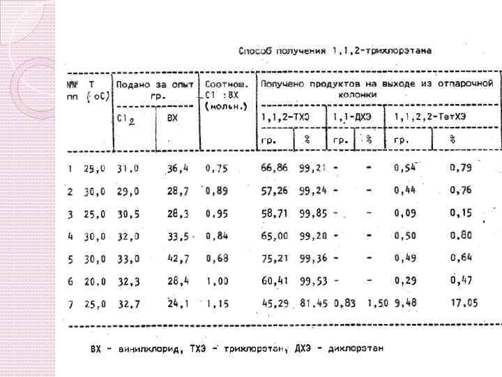 Способ получения 1, 1, 2 -трихлоэтана В данной работе рассматривается способ получения 1, 1, 2 -тризлорэтана, состоящим в том, что жидкофазное хлорирование винилхлорида в среде 1, 1, 2 -трихлорэтана ведут хлором в присутствии катализатора хлорного железа при 20 -30 о. С при мольном соотношении хлора и винилхлорида 0, 8 -1, 0: 1 с рециркуляцией непрореагировавшего винилхлорида в начало процесса. При практическом ведении процесса растворенный в реакционной массе непрореагировавший винилхлорид отделяют, например, простой перегонкой, затем возвращают на хлорирование. Благодаря избытку винилхлорида в реакционной зоне удаляется существенно снизить образование побочных продуктов и увеличить выход целевого продукта 1, 1, 2 -трихлорэтана до 99, 9 -99, 5%.