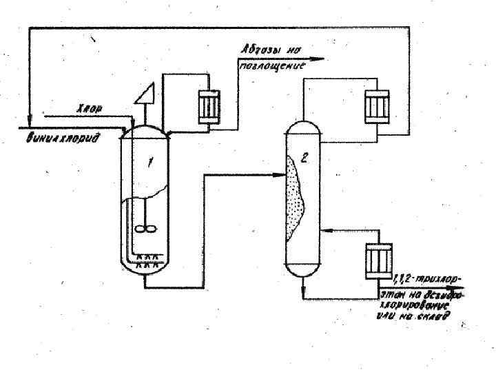 Формула изобретения Способ получения 1, 1, 2 -трихлорэтана путем жидкофазного хлорирования винилхлорида хлором при температуре 20 -30 о. С в присутствии катализатора хлорного железа в среде 1, 1, 2 -трихлорэтана, отличающийся тем, что с целью увеличения выхода целевого продукта и ликвидации вредных сточных вод, процесс ведут при мольном соотношении хлора и винилхлорида , равном 0, 8 -1: 1, с рециркуляцией непрореагировавшего винилхлорида в начале процесса.