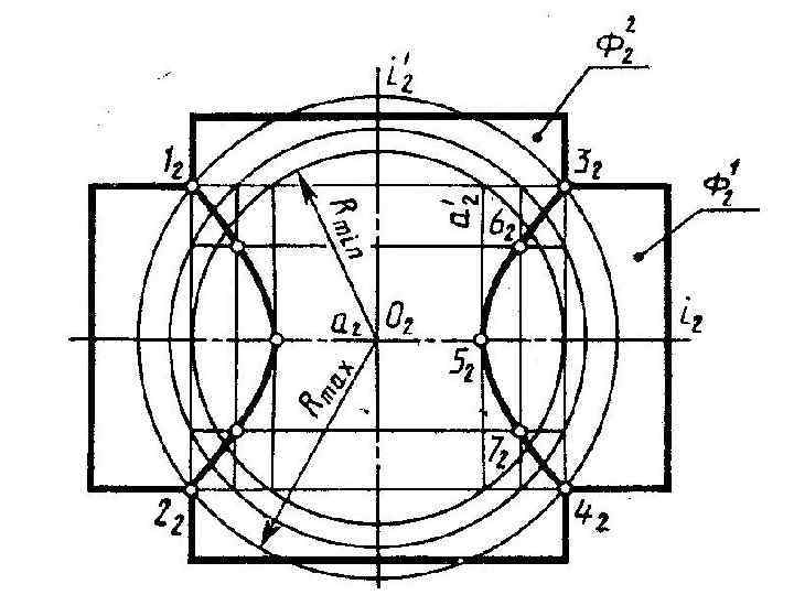 Способ вспомогательных секущих сфер Концентрические сферические посредники. Данный способ применяется когда оси поверхностей вращения пересекаются и параллельны какой-либо плоскости проекций. Центр сфер – посредников берется в точке пересечения осей поверхностей вращения. Сферы пересекают поверхности вращения по окружностям. Эти окружности проецируются на одной плоскости проекций в виде окружностей, на другой плоскости проекций в виде отрезков прямых, перпендикулярных оси вращения.