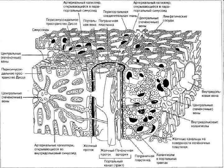 Тканевой состав Печень - паренхиматозный дольчатый орган. Ее строма представлена: • капсулой из плотной волокнистой соединительной ткани (капсула Глиссона) • прослойками рыхлой волокнистой соединительной ткани, которые делят орган на дольки. Внутри дольки строма представлена ретикулярными волокнами, лежащими между гемокапиллярами и печеночными балками. В норме у человека междольковая рыхлая волокнистая неоформленная соединительная ткань выражена слабо, в результате чего дольки определяются неотчетливо. При циррозе происходит утолщение соединительнотканных трабекул. Непосредственно под капсулой лежит один ряд гепатоцитов, образующий так называемую наружную терминальную пластинку. Этот ряд гепатоцитов в области ворот печени внедряется внутрь органа и сопровождает ветвления сосудов (воротной вены и печеночной артерии).