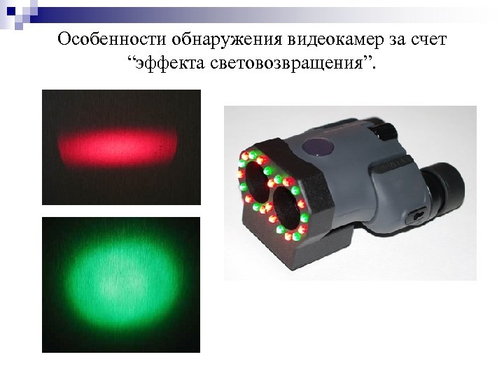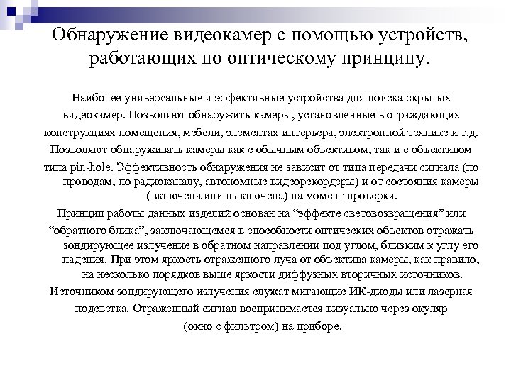 Обнаружение видеокамер с помощью устройств, работающих по оптическому принципу. Наиболее универсальные и эффективные устройства для поиска скрытых видеокамер. Позволяют обнаружить камеры, установленные в ограждающих конструкциях помещения, мебели, элементах интерьера, электронной технике и т. д. Позволяют обнаруживать камеры как с обычным объективом, так и с объективом типа pin-hole. Эффективность обнаружения не зависит от типа передачи сигнала (по проводам, по радиоканалу, автономные видеорекордеры) и от состояния камеры (включена или выключена) на момент проверки. Принцип работы данных изделий основан на “эффекте световозвращения” или “обратного блика”, заключающемся в способности оптических объектов отражать зондирующее излучение в обратном направлении под углом, близким к углу его падения. При этом яркость отраженного луча от объектива камеры, как правило, на несколько порядков выше яркости диффузных вторичных источников. Источником зондирующего излучения служат мигающие ИК-диоды или лазерная подсветка. Отраженный сигнал воспринимается визуально через окуляр (окно с фильтром) на приборе.