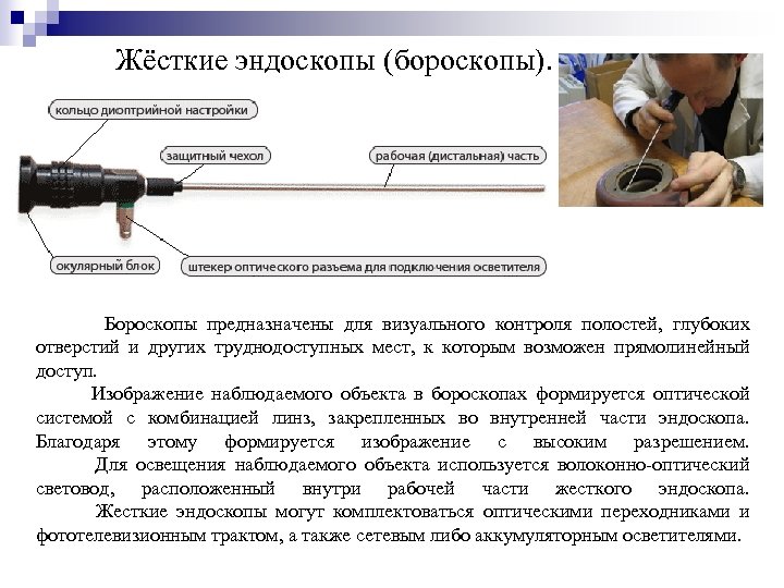 Жёсткие эндоскопы (бороскопы). Бороскопы предназначены для визуального контроля полостей, глубоких отверстий и других труднодоступных мест, к которым возможен прямолинейный доступ. Изображение наблюдаемого объекта в бороскопах формируется оптической системой с комбинацией линз, закрепленных во внутренней части эндоскопа. Благодаря этому формируется изображение с высоким разрешением. Для освещения наблюдаемого объекта используется волоконно-оптический световод, расположенный внутри рабочей части жесткого эндоскопа. Жесткие эндоскопы могут комплектоваться оптическими переходниками и фототелевизионным трактом, а также сетевым либо аккумуляторным осветителями.