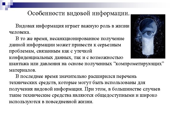Особенности видовой информации. Видовая информация играет важную роль в жизни человека. В то же время, несанкционированное получение данной информации может привести к серьезным проблемам, связанным как с утечкой конфиденциальных данных, так и с возможностью шантажа или давления на основе полученных “компрометирующих” материалов. В последнее время значительно расширился перечень технических средств, которые могут быть использованы для получения видовой информация. При этом, в большинстве случаев такие технические средства являются общедоступными и широко используются в повседневной жизни.