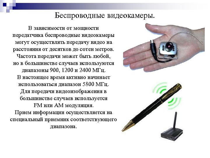 Беспроводные видеокамеры. В зависимости от мощности передатчика беспроводные видеокамеры могут осуществлять передачу видео на расстояния от десятков до сотен метров. Частота передачи может быть любой, но в большинстве случаев используются диапазоны 900, 1200 и 2400 МГц. В настоящее время активно начинает использоваться диапазон 5800 МГц. Для передачи видеоизображения в большинстве случаев используется FM или AM модуляция. Прием информации осуществляется на специальный приемник соответствующего диапазона.