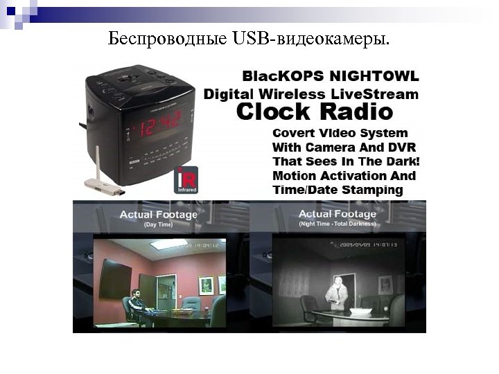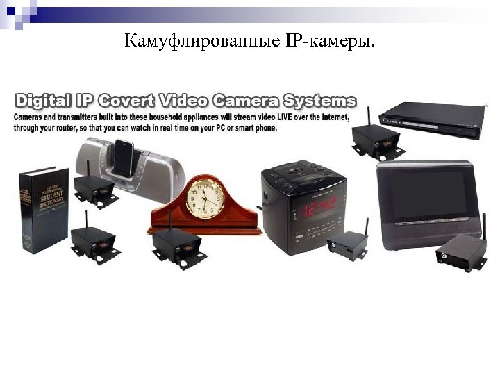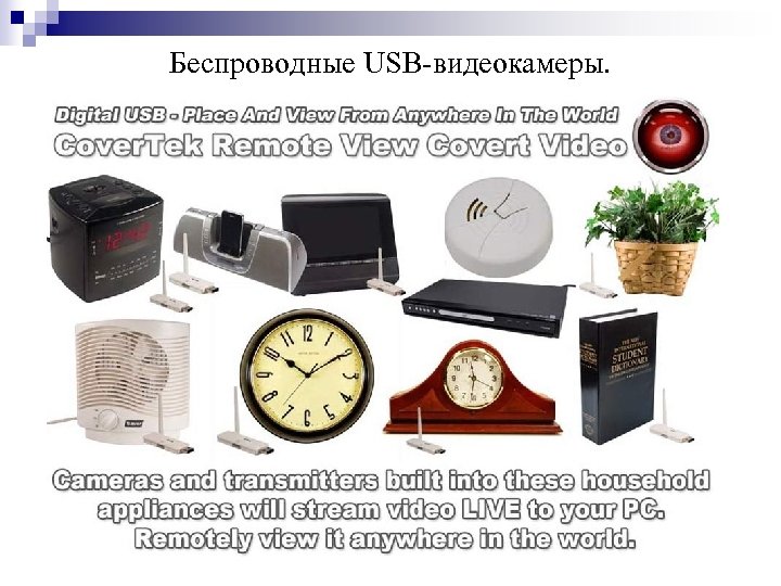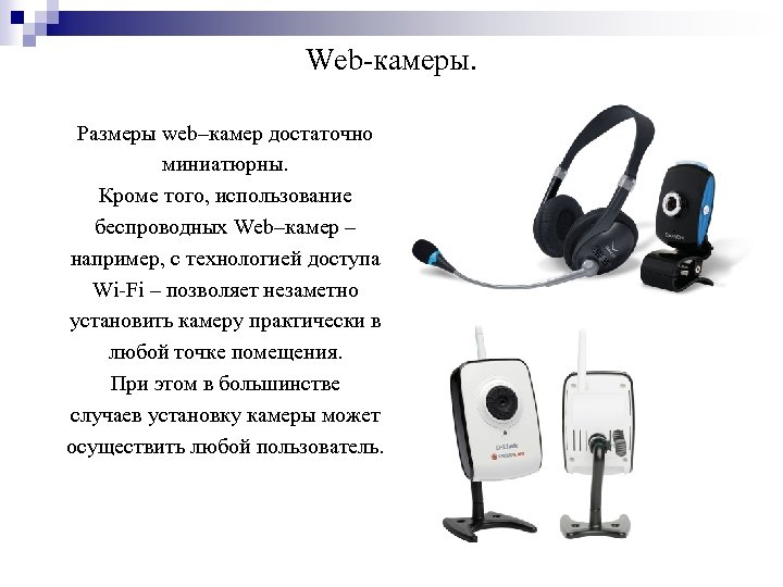 Web-камеры. Размеры web–камер достаточно миниатюрны. Кроме того, использование беспроводных Web–камер – например, с технологией доступа Wi-Fi – позволяет незаметно установить камеру практически в любой точке помещения. При этом в большинстве случаев установку камеры может осуществить любой пользователь.