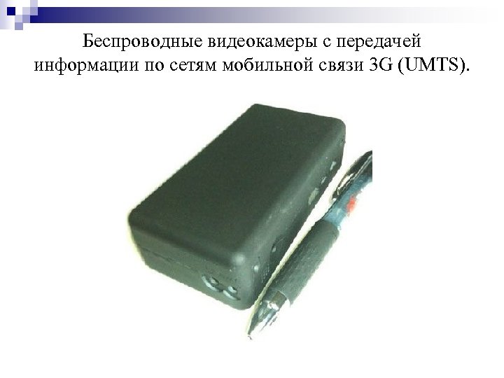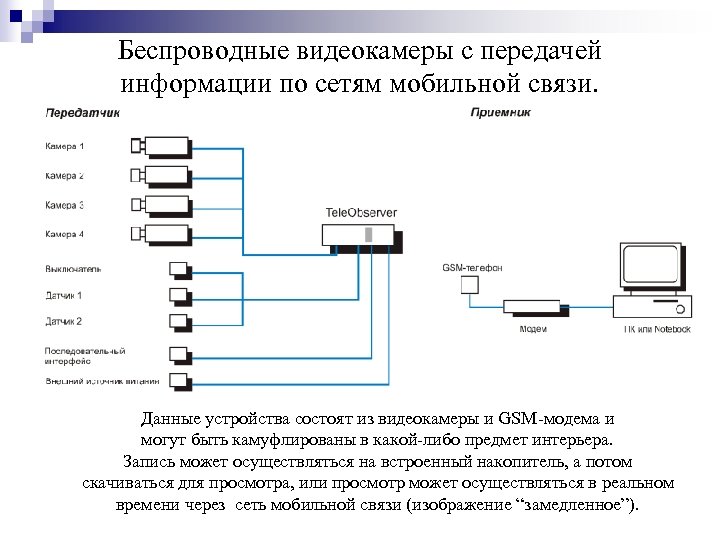 Беспроводные видеокамеры с передачей информации по сетям мобильной связи. Данные устройства состоят из видеокамеры и GSM-модема и могут быть камуфлированы в какой-либо предмет интерьера. Запись может осуществляться на встроенный накопитель, а потом скачиваться для просмотра, или просмотр может осуществляться в реальном времени через сеть мобильной связи (изображение “замедленное”).