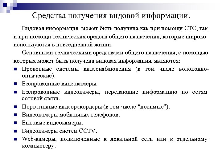 Средства получения видовой информации. Видовая информация может быть получена как при помощи СТС, так и при помощи технических средств общего назначения, которые широко используются в повседневной жизни. Основными техническими средствами общего назначения, с помощью которых может быть получена видовая информация, являются: n Проводные системы видеонаблюдения (в том числе волоконнооптические). n Беспроводные видеокамеры, передающие информацию по сетям сотовой связи. n Портативные видеорекордеры (в том числе “носимые”). n Видеокамеры мобильных телефонов. n Бытовые видеокамеры. n Видеокамеры систем CCTV. n Web-камеры, подключенные к локальной сети или к отдельному компьютеру.