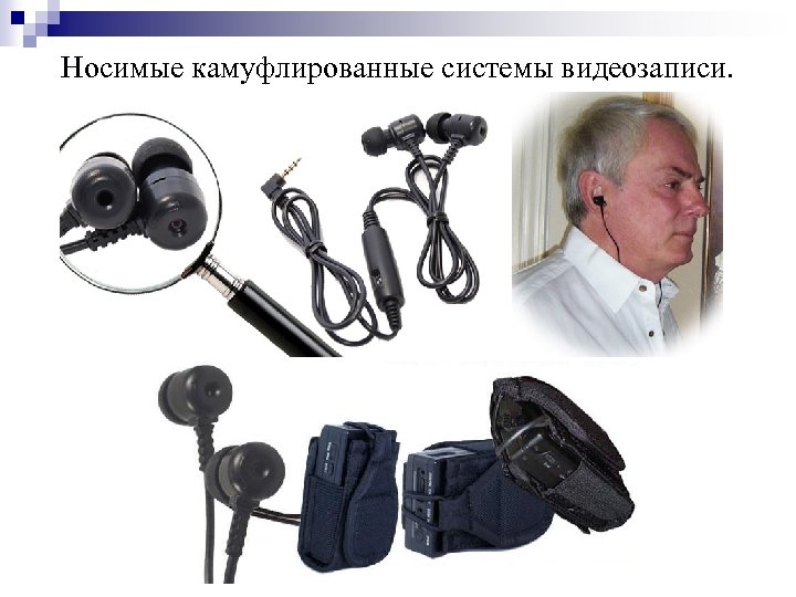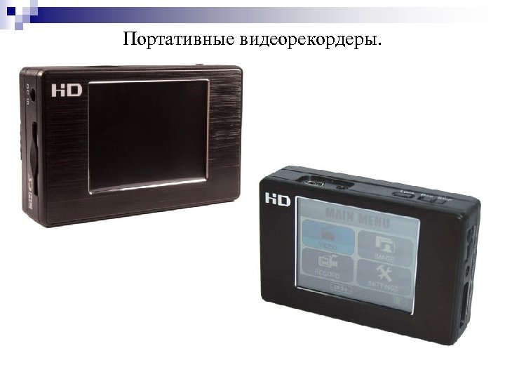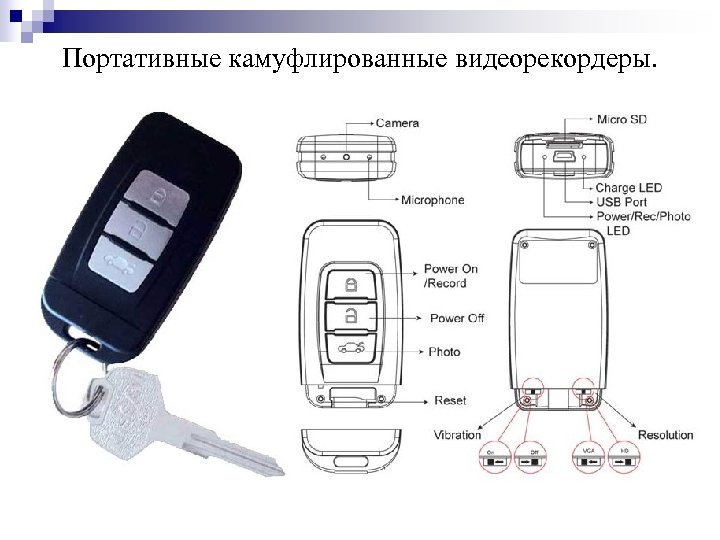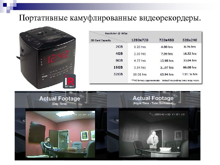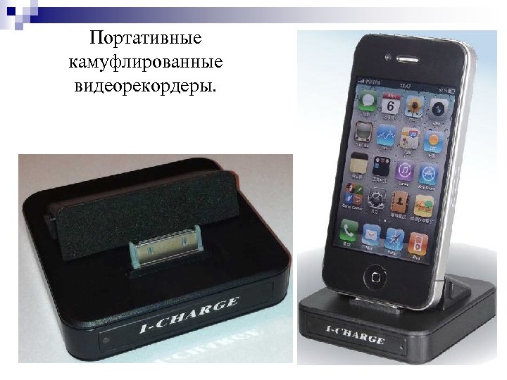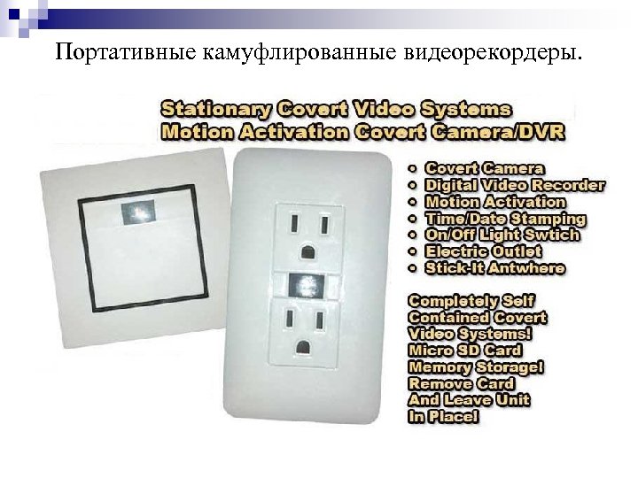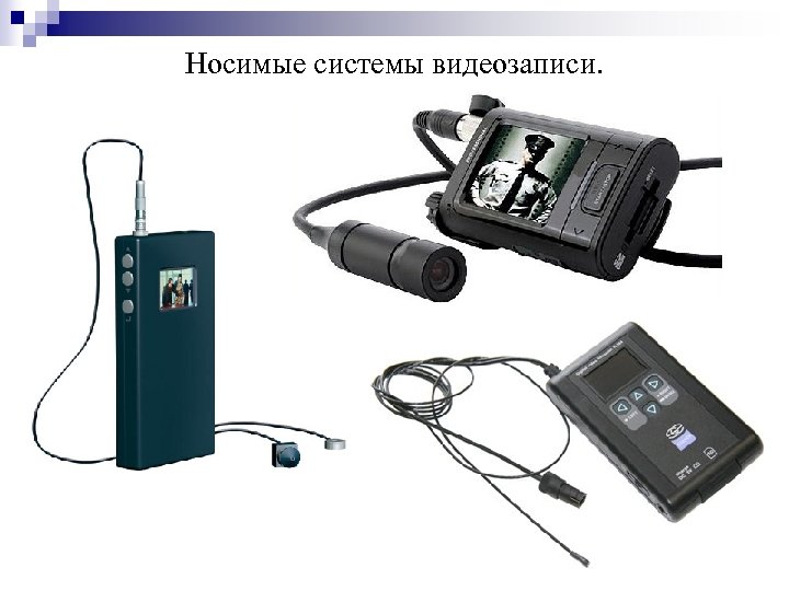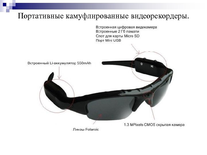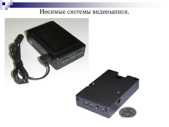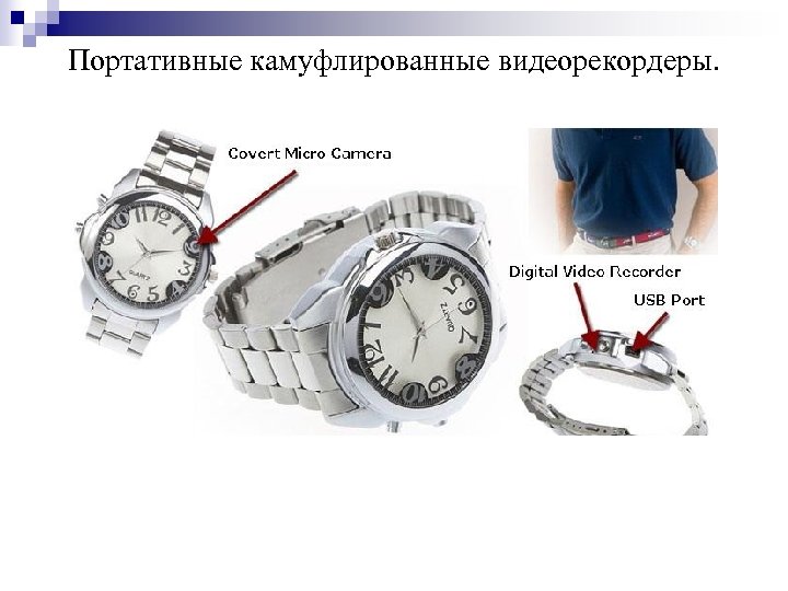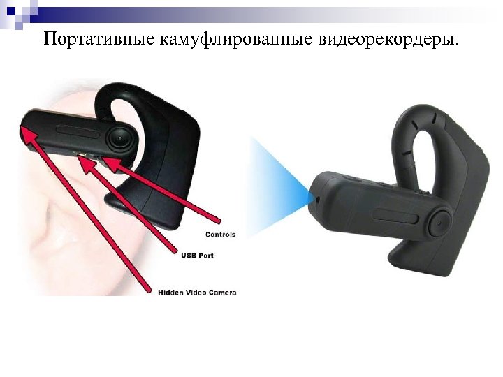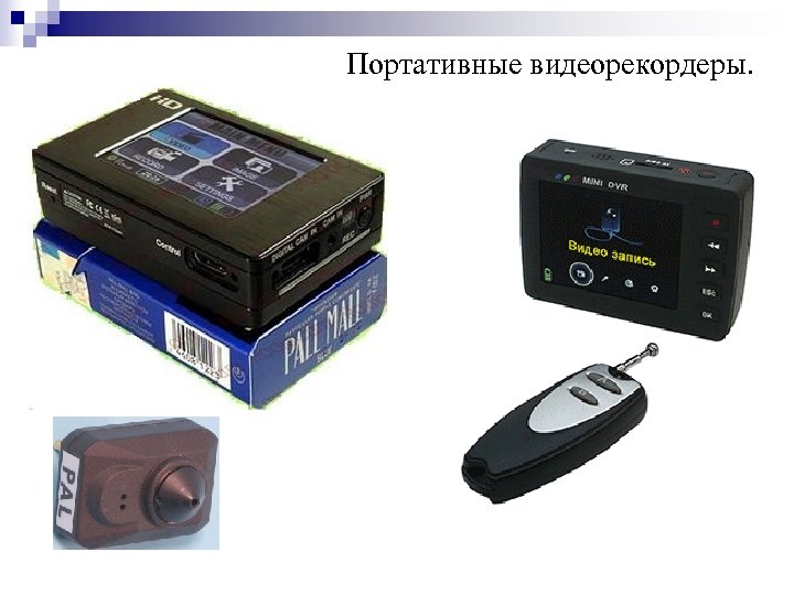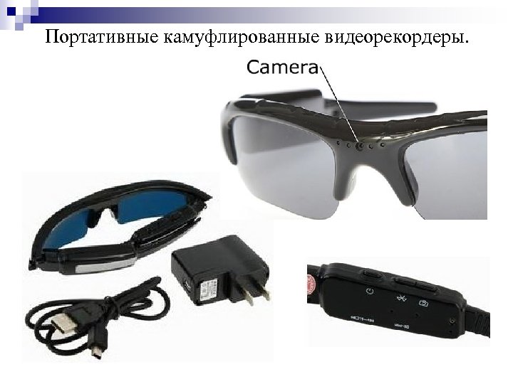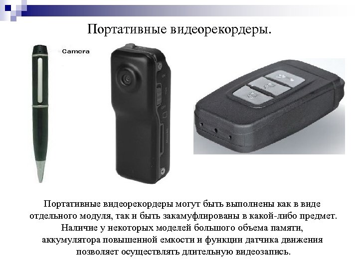 Портативные видеорекордеры. Портативные видеорекордеры могут быть выполнены как в виде отдельного модуля, так и быть закамуфлированы в какой-либо предмет. Наличие у некоторых моделей большого объема памяти, аккумулятора повышенной емкости и функции датчика движения позволяет осуществлять длительную видеозапись.