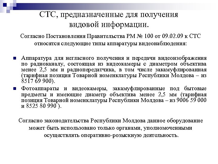 СТС, предназначенные для получения видовой информации. Согласно Постановления Правительства РМ № 100 от 09. 02. 09 к СТС относятся следующие типы аппаратуры видеонаблюдения: n n Аппаратура для негласного получения и передачи видеоизображения по радиоканалу, состоящая из видеокамеры с диаметром объектива менее 2, 5 мм и радиопередатчика, в том числе закамуфлированная (тарифная позиция Товарной номенклатуры Республики Молдова – из 8517 69 900). Фотоаппараты и видеокамеры, закамуфлированные под бытовые предметы и имеющие диаметр объектива менее 2, 5 мм (тарифная позиция Товарной номенклатуры Республики Молдова – из 9006 59 000 и 8525 80 990 ). Согласно законодательства Республики Молдова данное оборудование может быть использовано только органами, уполномоченными осуществлять оперативно-розыскную деятельность.