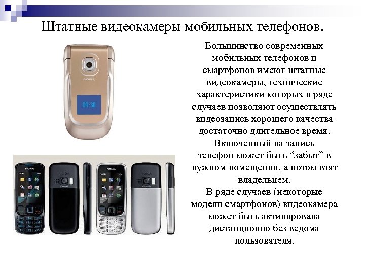 Штатные видеокамеры мобильных телефонов. Большинство современных мобильных телефонов и смартфонов имеют штатные видеокамеры, технические характеристики которых в ряде случаев позволяют осуществлять видеозапись хорошего качества достаточно длительное время. Включенный на запись телефон может быть “забыт” в нужном помещении, а потом взят владельцем. В ряде случаев (некоторые модели смартфонов) видеокамера может быть активирована дистанционно без ведома пользователя.