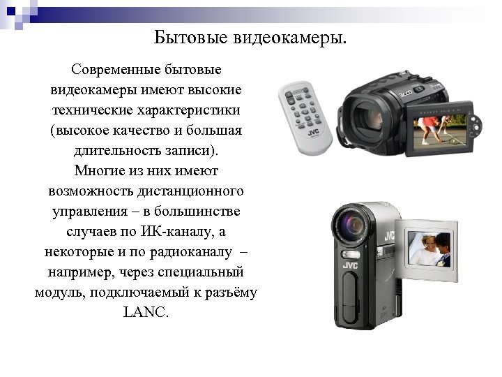 Бытовые видеокамеры. Современные бытовые видеокамеры имеют высокие технические характеристики (высокое качество и большая длительность записи). Многие из них имеют возможность дистанционного управления – в большинстве случаев по ИК-каналу, а некоторые и по радиоканалу – например, через специальный модуль, подключаемый к разъёму LANC.
