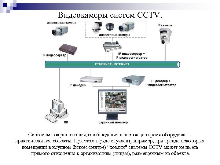 Видеокамеры систем CCTV. Системами охранного видеонаблюдения в настоящее время оборудованы практически все объекты. При этом в ряде случаев (например, при аренде некоторых помещений в крупном бизнес-центре) “хозяин” системы CCTV может не иметь прямого отношения к организациям (лицам), размещенным на объекте.