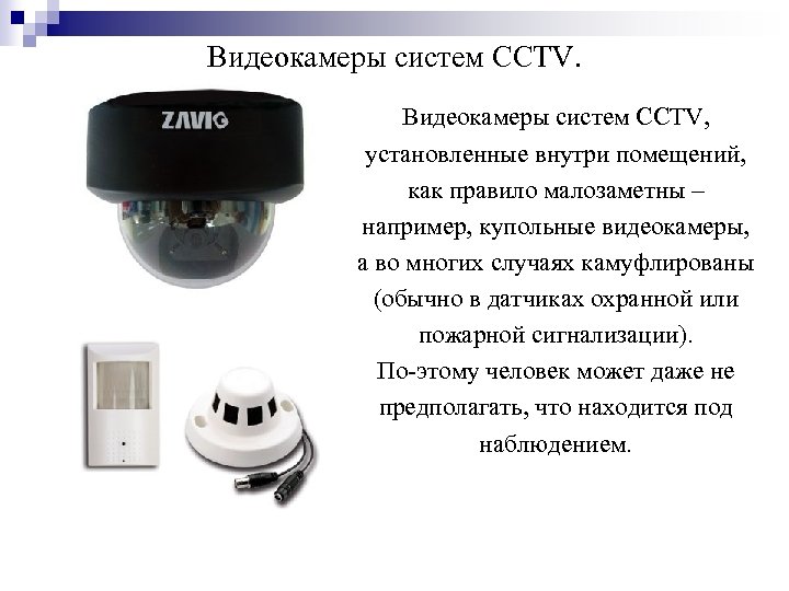 Видеокамеры систем CCTV, установленные внутри помещений, как правило малозаметны – например, купольные видеокамеры, а во многих случаях камуфлированы (обычно в датчиках охранной или пожарной сигнализации). По-этому человек может даже не предполагать, что находится под наблюдением.