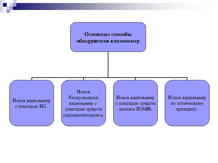 Основные способы обнаружения видеокамер Поиск видеокамер с помощью НЛ. Поиск беспроводных видеокамер с помощью средств радиомониторинга. Поиск видеокамер с помощью средств анализа ПЭМИ. Поиск видеокамер по оптическому принципу.
