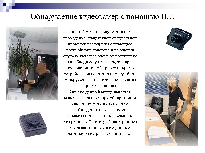 Обнаружение видеокамер с помощью НЛ. Данный метод предусматривает проведение стандартной специальной проверки помещения с помощью нелинейного локатора и во многих случаях является очень эффективным (необходимо учитывать, что при проведении такой проверки кроме устройств видеоконтроля могут быть обнаружены и электронные средства прослушивания). Однако данный метод является малоэффективным при обнаружении волоконно-оптических систем наблюдения и видеокамер, закамуфлированных в предметы, содержащие “штатную” электронику: бытовая техника, электронные датчики, электронные часы и т. д.