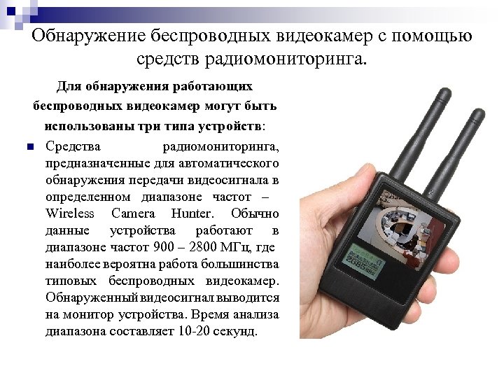 Обнаружение беспроводных видеокамер с помощью средств радиомониторинга. n Средства радиомониторинга, предназначенные для обнаружения и локализации различных работающих радиопередающих устройств. Данные устройства могут быть как простыми – например, обычный детектор поля, – так и достаточно сложными, позволяющими не только обнаружить наличие радиоизлучения, но и определить его частоту и вид сигнала (например, при использовании видеокамер с передачей информации по сетям GSM или беспроводных Web– камер с технологией доступа Wi-Fi).